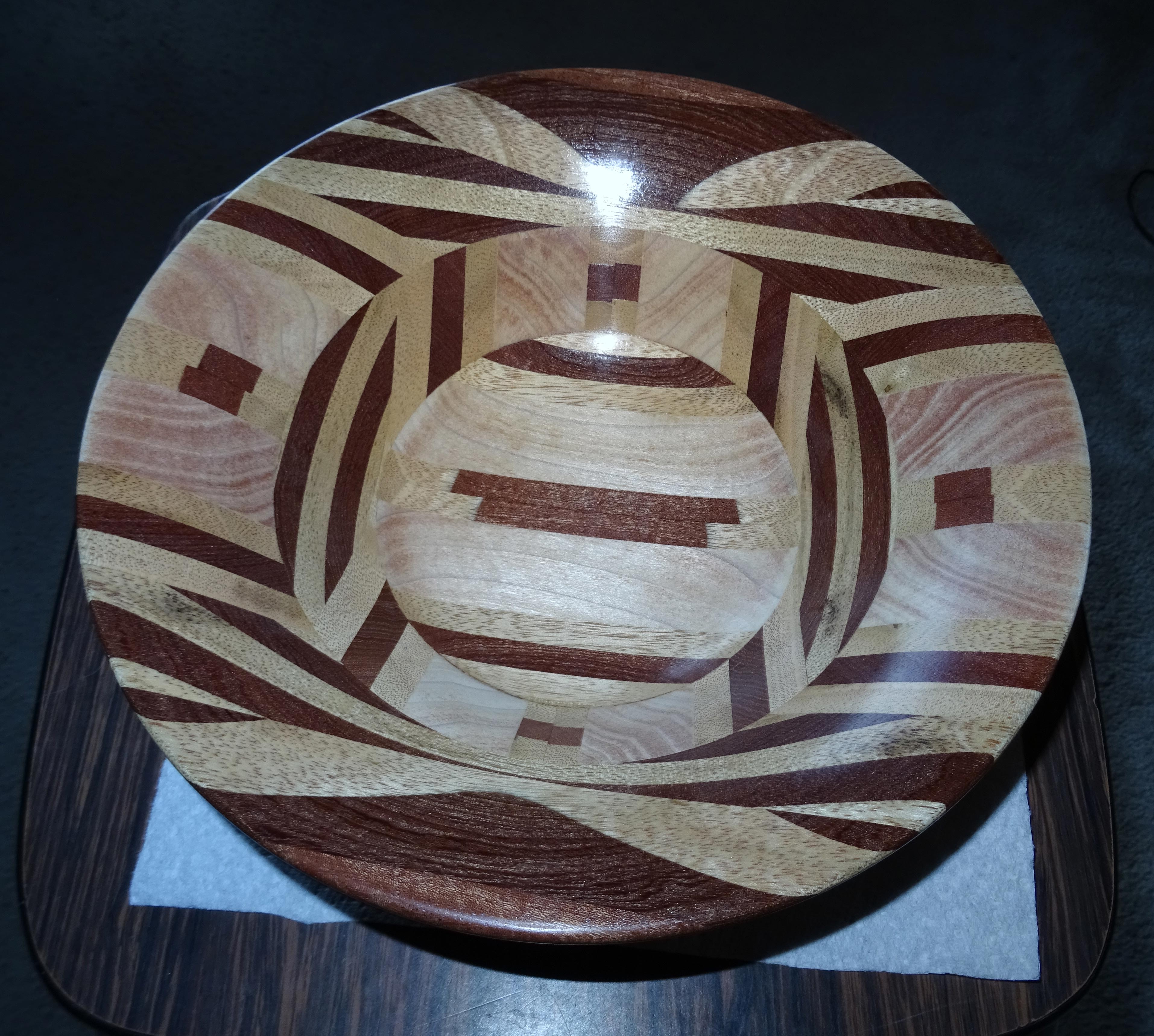 Laminated bowl made from off-cut, planed up to a regular thickness and glued together to make a board 560 mm long x 125mm wide by 28 mm thick. This board was then planed to 25mm thickness cut inn half and reversed around to form a board 280 x 250 x 25mm. this was marked out circles using the centre joint as a centre and the maximum radius of 125mm and 2 concentric circles at 25mm less radius than the previous setting. the outer circle is cut with the bandsaw set at 90 deg and the two inner ones cut with the table tilted over to 45 deg. these are then glued together to form ring keeping the joints flat. when these have set then the 3 ring are glued together in a cone shape and pressure applied. when the glue is cured i then mounted the bowl in my cole jaws and turned a spigot on the bottom for my large bowl jaws about 80 mm, the bowl was then turned both inside and out. it was finally reversed back into the cole jaws to finish of the base.