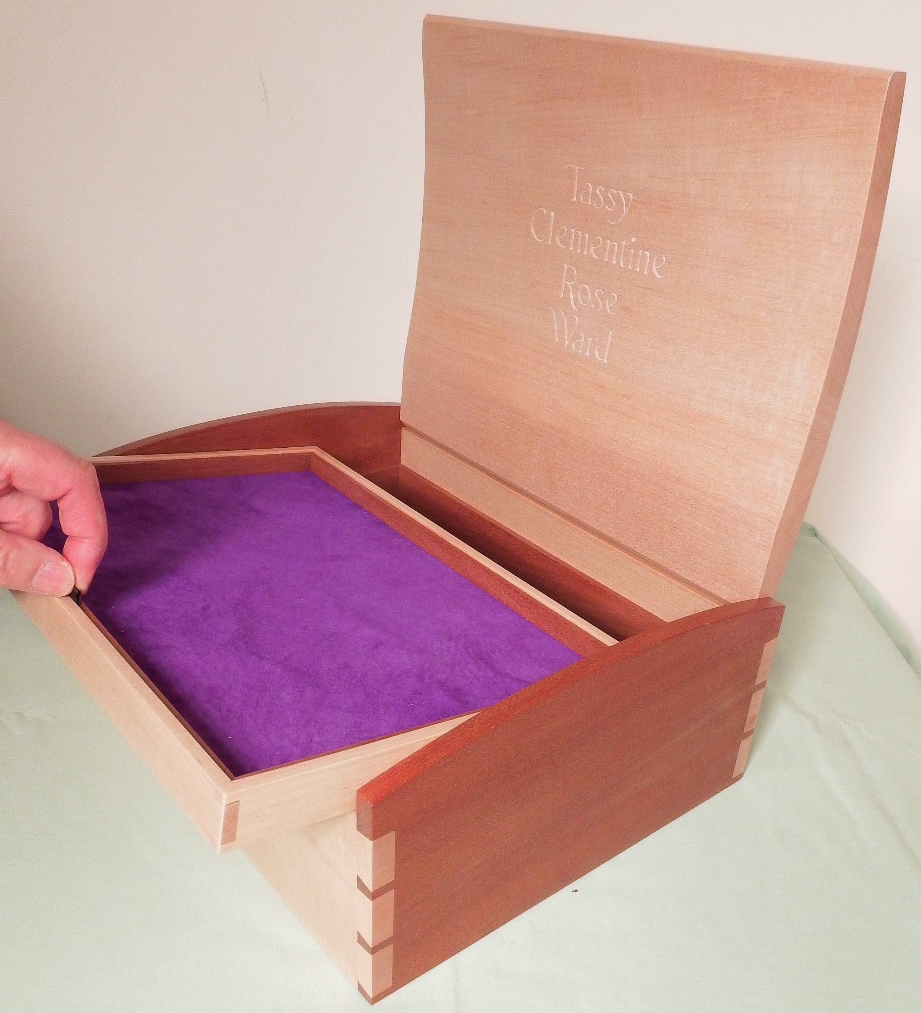 Commissioned by a client as a gift for his young grand-daughter, this box is intended as a life-time gift - that she will enjoy adding to its contents and remembering happy times throughout her life. It's in maple and sapele with a purple suede trim. The tray and the lower part of the box are lined with 3mm sapele which also serves to support the lift-out tray.
