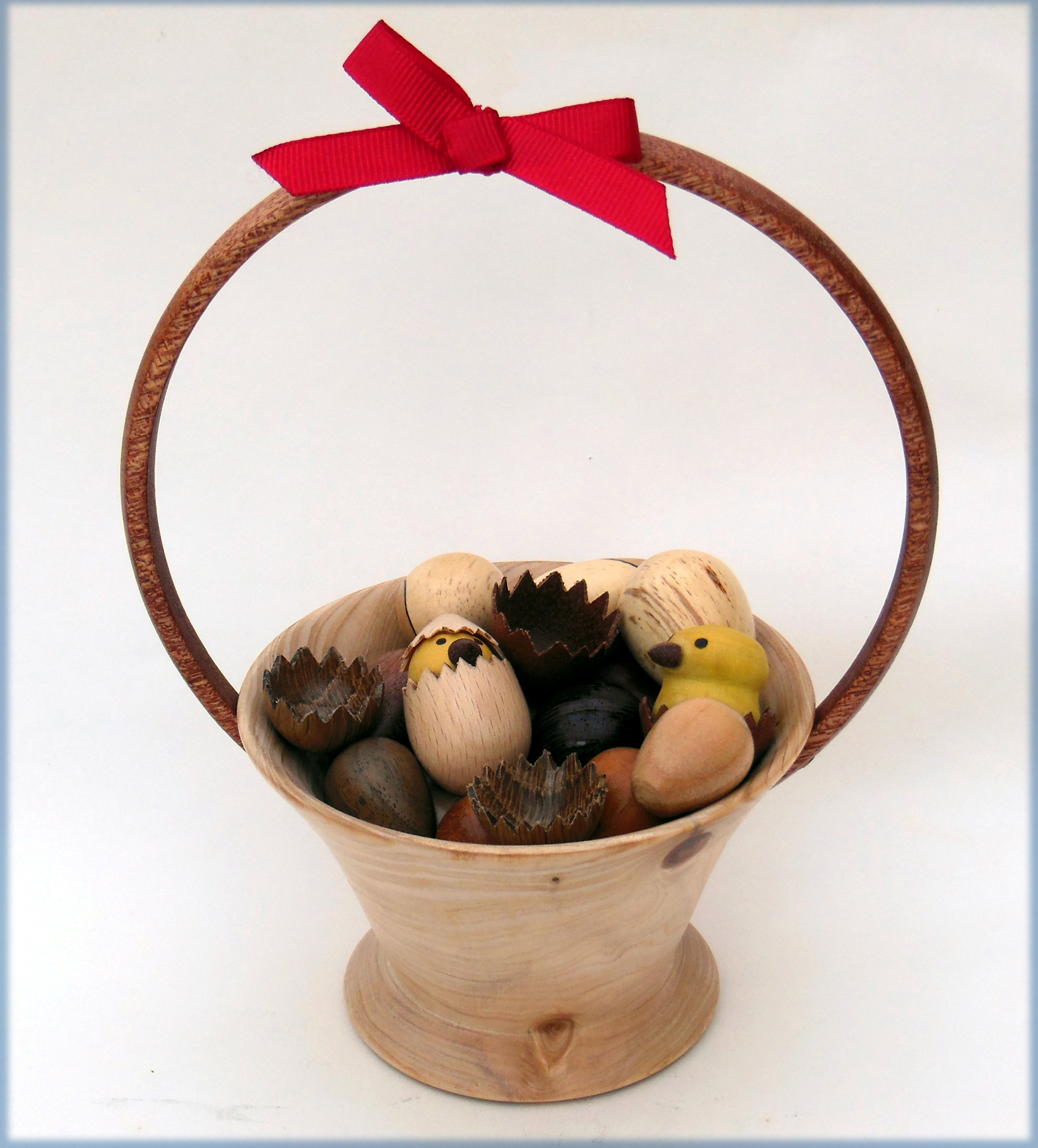 The basket is leylandii and the eggs and handle are made from 10 different woods. The chicks are berberis.