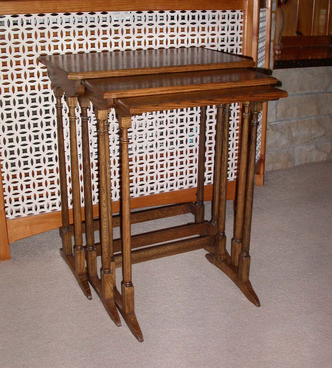 Nest of 3 Oak tables turned legs and back rails tenoned into the legs, the return rail is a mitred dovetail. The tops were made from 18 mm MDF lipped all round with Oak lippings that were tongued and grooved into the top. the tops were then veneered both sides with an Oak veneer the top faces being quartered. dark stained with a spirit stain and finished with a fortified french polish, finally being waxed with a dark Oak wax. Each separate table was carried in a rebate on the inside of the top rails of the table above, the tops being attached the the under frames with dowels.