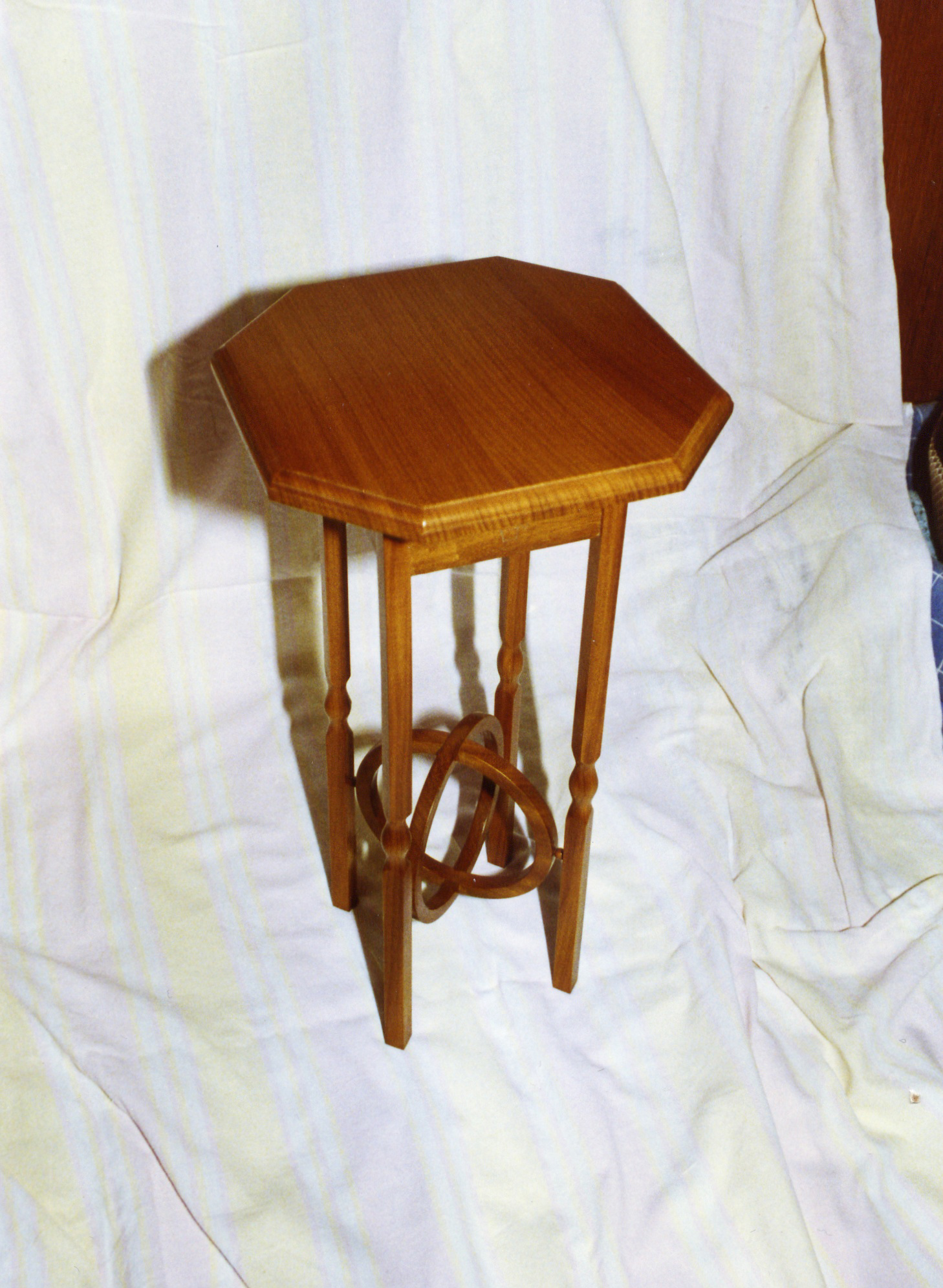a small table with an unusual leg and stretcher arrangement, The leg faces rotate 45 degrees at the knee but the legs are all solid pieces, the face rotation being achieved entirely by planing the faces at 45 degrees to each other befor mounting on my lathe and the knee turned at the point of intersection of the faces, the bottom stretcher was made from two separate rings turned on the lathe and halved together, The table was made from Afromosia and finished naturally with a fortified french polish,