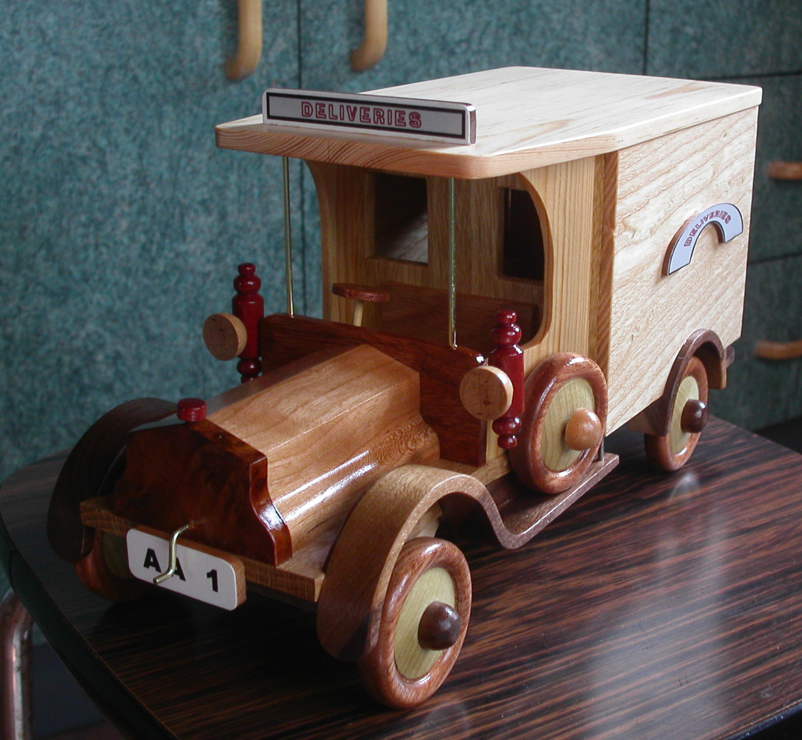 Designed on my cad program and made from a variety of timbers. Wheels were made in two parts with the tyres made from American Black Walnut and the wheel made of Sycamore. All shaping of the various components was by hand and the whole assembly was glued together (no pins or screws used), the crank handle/steering column and roof supports were made from 1.5mm brass wire. The unit after cleaning up was finished with a clear acrylic lacquer spray.