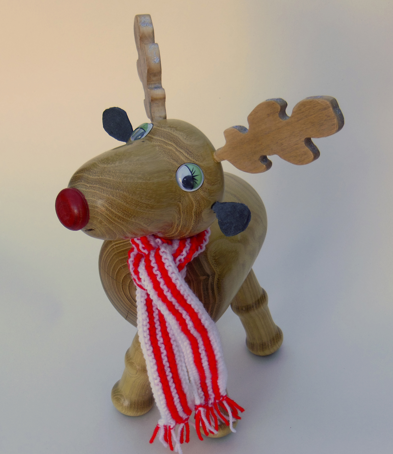 Head body and legs turned. Antlers cut out with scroll saw. Nose coloured with acrylic paint. Finished with cellulose sanding sealer and carnauba wax.